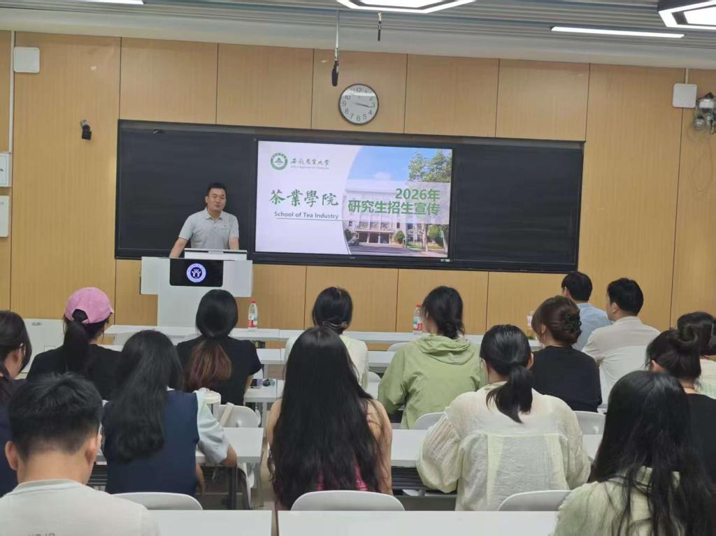 活动伊始,罗波对来访嘉宾进行介绍,随后周棋赢分享了公司的考研情况。紧接着,张照亮围绕茶学专业公司产品展开系统宣讲。他指出,攻读茶学研究生是顺应茶产业蓬勃发展态势、深化专业认知、提升科研与实践能力的重要途径,有助于个人在学术研究、产业创新等方向实现更高价值。谈及选择安徽农业大学茶学专业的优势,张照亮表示,公司拥有深厚的茶学学科底蕴,依托国家级科研平台与优质团队团队,在茶树遗传育种、茶叶加工与品质调控、茶文化传播等领域成果丰硕,可为员工提供丰富的学术资源与前沿研究方向。在人才培养上,安徽农业大学致力于培养兼具扎实理论基础、创新实践能力和国际视野的复合型茶学人才,使其能够在茶产业全链条中发挥关键作用。在培养模式方面,公司通过“产学研用”深度融合,为员工提供参与国家级科研项目、行业实践和国际学术交流的机会,助力员工全面成长。最后,宋传奎与张照亮还结合自身经历,与同学们进行考研读博经验分享,就专业选择、备考策略、学术规划等问题展开深入交流,并鼓励同学们保持对茶学的热爱,积极投身专业领域深造,以扎实的学识和创新精神为茶产业发展贡献力量。